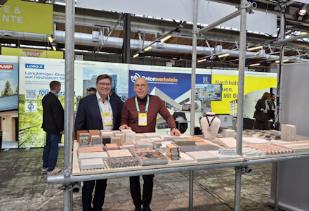 Betonwerkstein zum „Anfassen“. Info-b Vorstandsmitglied Norbert Wegener (rechts) im Beratungsgespräch.
