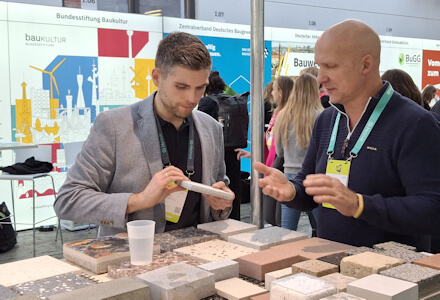 „Die Bauwende gelingt nur gemeinsam – durch Materialinnovation, Ressourceneffizienz und einen offenen Dialog zwischen Industrie, Planung und Wissenschaft. Unser Beitrag auf dem Heinze Klimafestival ist ein wichtiger Schritt, um den konstruktiven Austausch über nachhaltige Baustoffstrategien weiter zu stärken“, so Harry Schwab (Schwab-Stein GmbH, Horb-Dettingen), der Vorsitzende des Vorstands der Info-b. Zusammen mit seinen Vorstandskollegen Dr. Stefan Hauser (DUCON GmbH, Darmstadt) und Norbert Wegener (Wegener Betonstein, Großpösna) sowie den Geschäftsführern Stefan Heeß (Dyckerhoff GmbH) und Dr. Ulrich Lotz (Fachverband Beton-und Fertigteilwerke Baden-Württemberg e.V.) standen sie am Stand der Info-b allen Interessierten als kompetente Gesprächspartner zur Verfügung. An der „Info-b Werkbank“ konnte man sich nicht nur über aktuelle Entwicklungen im Bereich Betonwerkstein informieren, sondern entsprechende Muster auch selbst in die Hand nehmen.